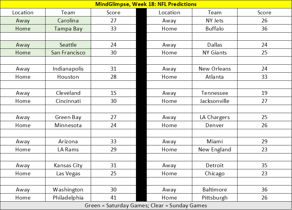 MINDGLIMPSE PREDICTIONS: NFL WEEK EIGHTEEN